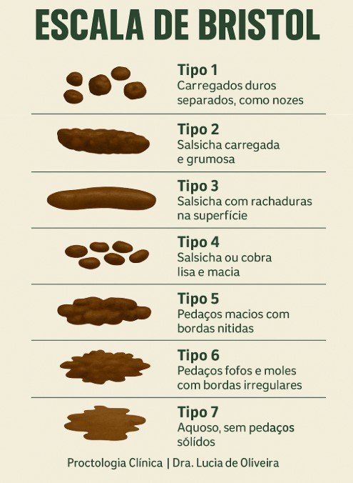 | Mudança repentina e persistente do padrão | Passa de Tipo 4 para 6–7 por semanas; aumento de urgência/frequência | Pode indicar infecção, SII, doença inflamatória, má absorção ou efeito de medicamentos | Marcar consulta com proctologista; se piora rápida ou desidratação, atendimento imediato |